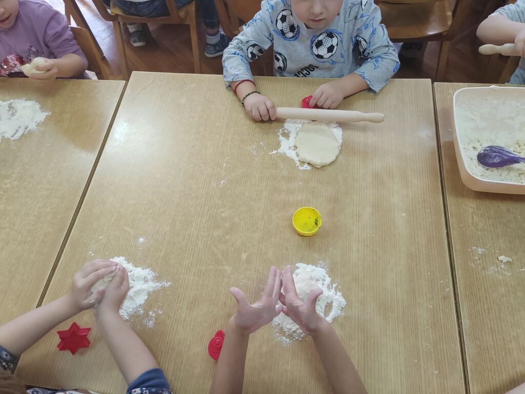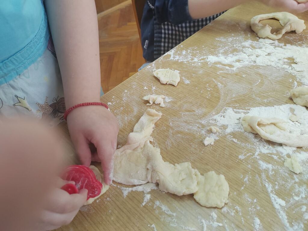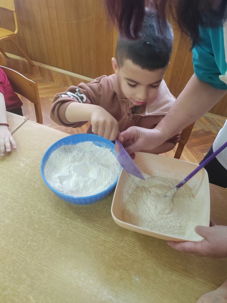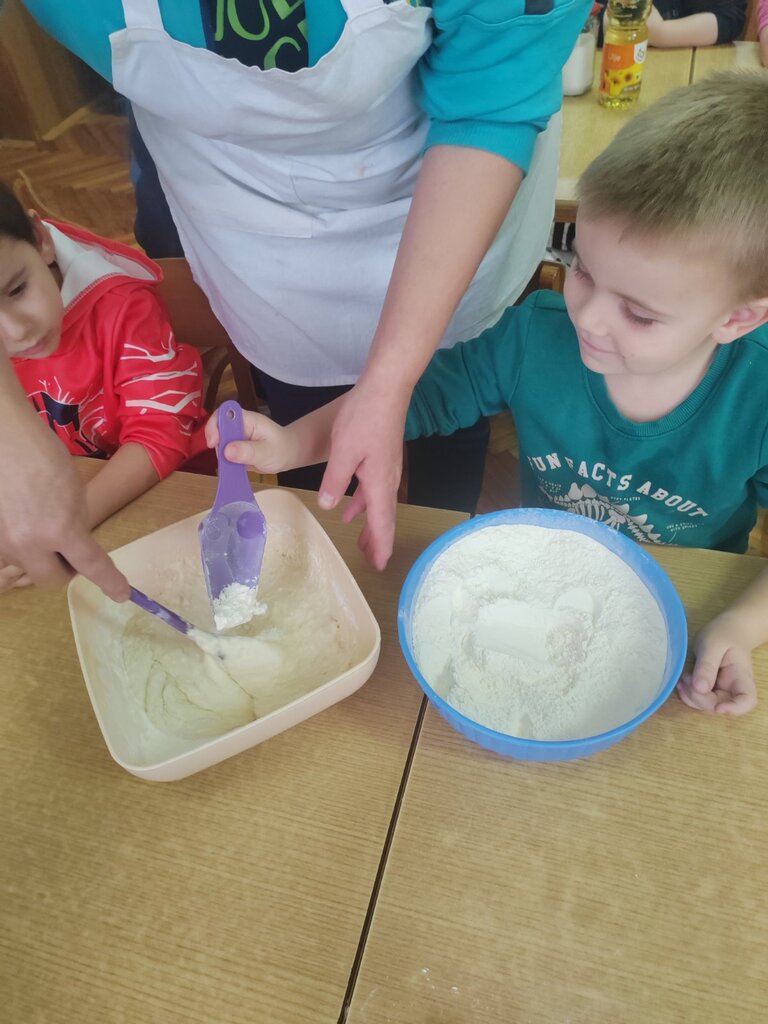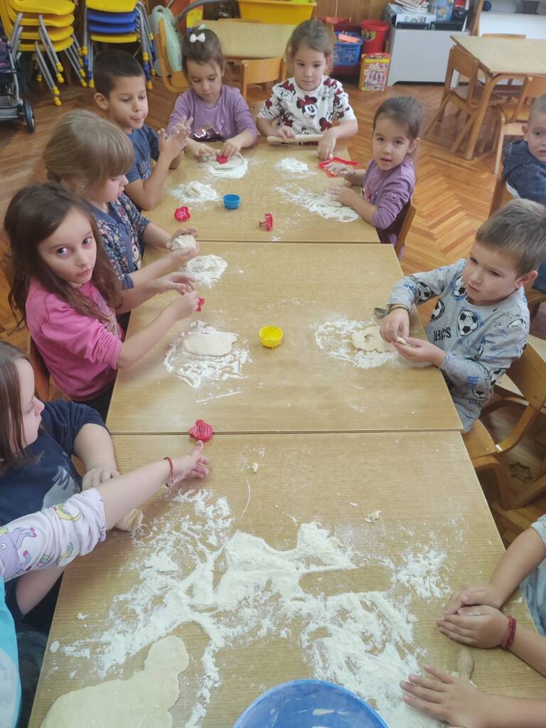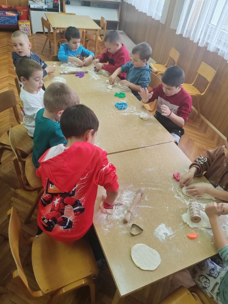 Roditelji su nam obezbedili sve potrebne sastojke i materijal:brašno, ulje, modle za testo, oklagije i dodatni pribor za oblikovanje. Deca su najpre posmatrala i učestvovala u mešanju sastojaka, dodavala brašno i pratila kako se formira testo. Radne površine su bile prepune brašna, deca su aktivno manipulisala materijalom, istraživala teksturu testa, vežbala finu motoriku, saradnju i kreativnost. Malo je reći da smo se svi zabavili i uživali.