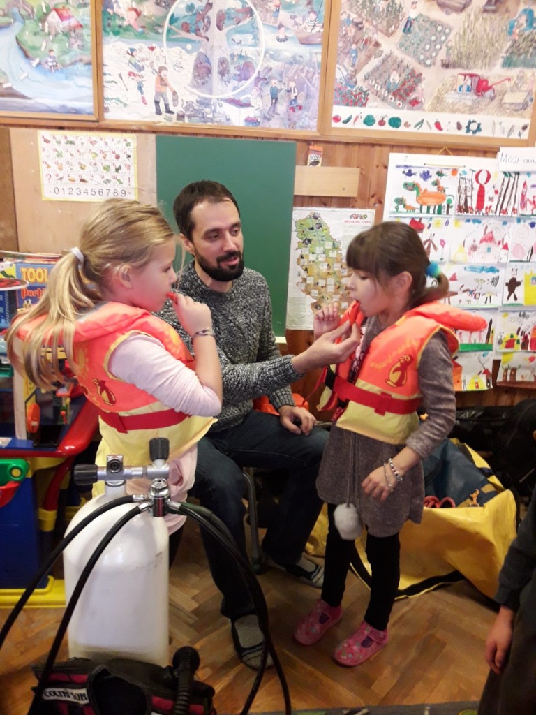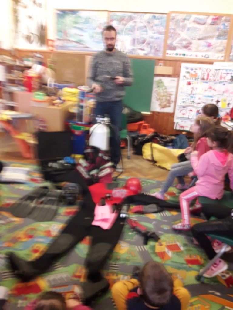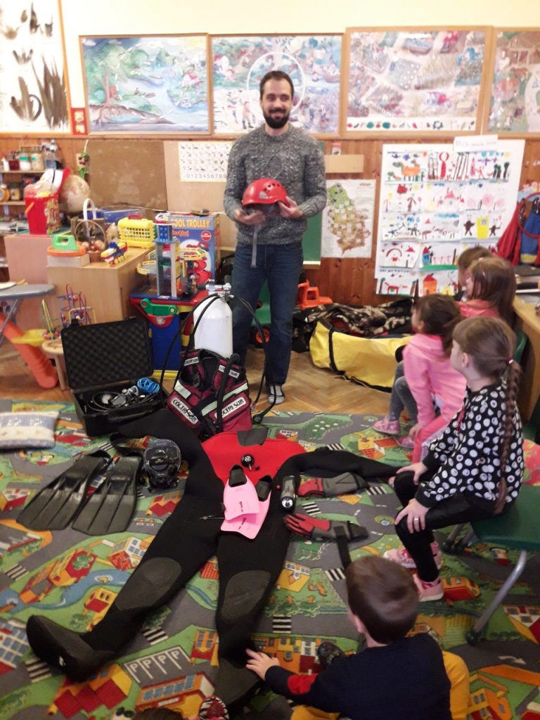 U goste je došao profesionalni ronioc, roditelj, Oto Ili, koji je ovom prilikom u okviru nedeljne teme o vodi i životu u vodi, predstavio našim mališanima svoje zanimanje. Razgovarao je sa decom o morima, okeanima, o tome koliku površinu zauzima voda na našoj planeti, a pored toga razgovarao je o tome šta je to i kako je to biti ronioc. Deca su pomno slušala i upijala svaku njegovu reč. Pored razgovora Oto je deci doneo i pokazao svu opremu koju koristi tokom ronjenja i čemu svaki deo opreme služi. Takođe, preneo je deci svoja iskustva o ronjenju i upoznao ih je sa različitim vrstama ronjenja (tehničko, industrijsko, speleo ronjenje i dr.) Naša deca su imala i mnogobrojna pitanja za dragog gosta, nizala su se jedno za drugim, poput: "da li si plivao u Mrtvom moru"; "kakvo je to Mrtvo more i zašto se tako zove";"šta si sve pronalazio u moru"; "da li su te nekada napale ajkule" i još mnoga druga, na koja je naš gost vrlo rado i sa puno ineresovanja odgovarao deci... Ovom prilikom se od sveg srca zahvaljujemo dragom roditelju i gostu koji je izdvojio svoje vreme i tako predivno predstavio deci svoju ljubav prema ronjenju, svojoj profesiji i naravno prirodi - konkretno ovaj put vodi. Hvala još jednom Oto. :)