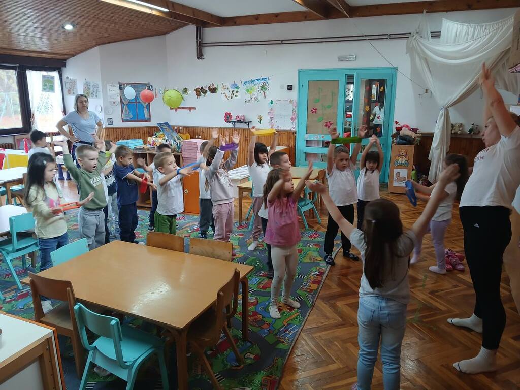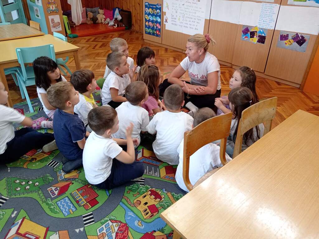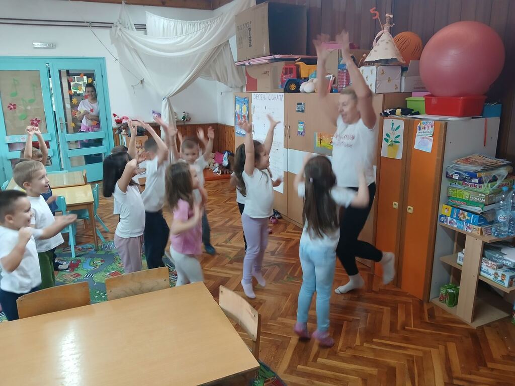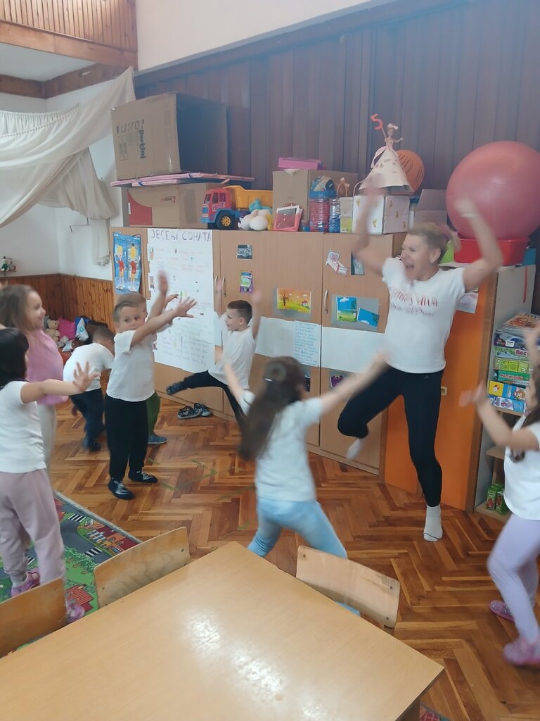 Naučili smo šta je to fitnes, kako se trenira, gde se trenira, šta je potrebno od opreme, koliko dugo traje jedan trening, ko može sve da trenira šta postižemo treninzima, koje mišiće pokrećemo i jačamo... Donela nam je pilates loptu kao i gumene trake na kojima smo radili vežbe. Takođe smo radili i vežbe uz muziku. Deci je bilo lepo i interesantno i svi zajedno smo uživali. 😄