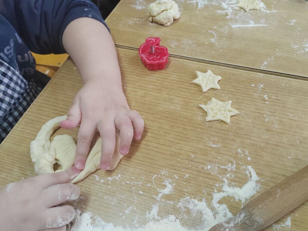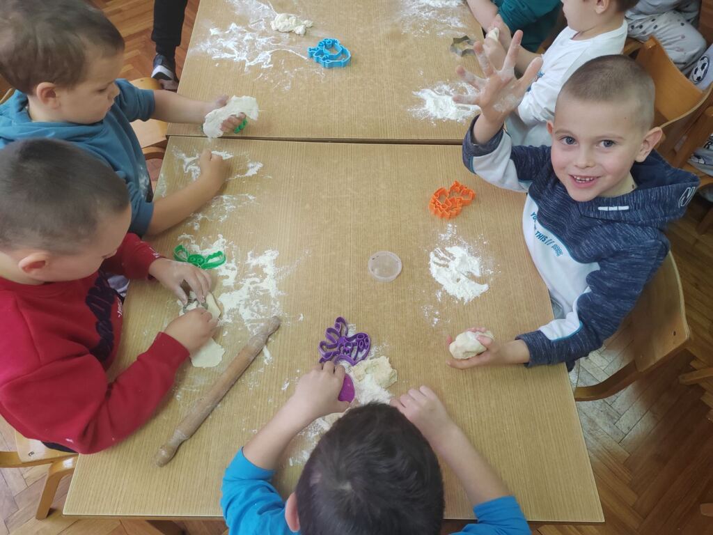 Roditelji su nam obezbedili sve potrebne sastojke i materijal:brašno, ulje, modle za testo, oklagije i dodatni pribor za oblikovanje. Deca su najpre posmatrala i učestvovala u mešanju sastojaka, dodavala brašno i pratila kako se formira testo. Radne površine su bile prepune brašna, deca su aktivno manipulisala materijalom, istraživala teksturu testa, vežbala finu motoriku, saradnju i kreativnost. Malo je reći da smo se svi zabavili i uživali.