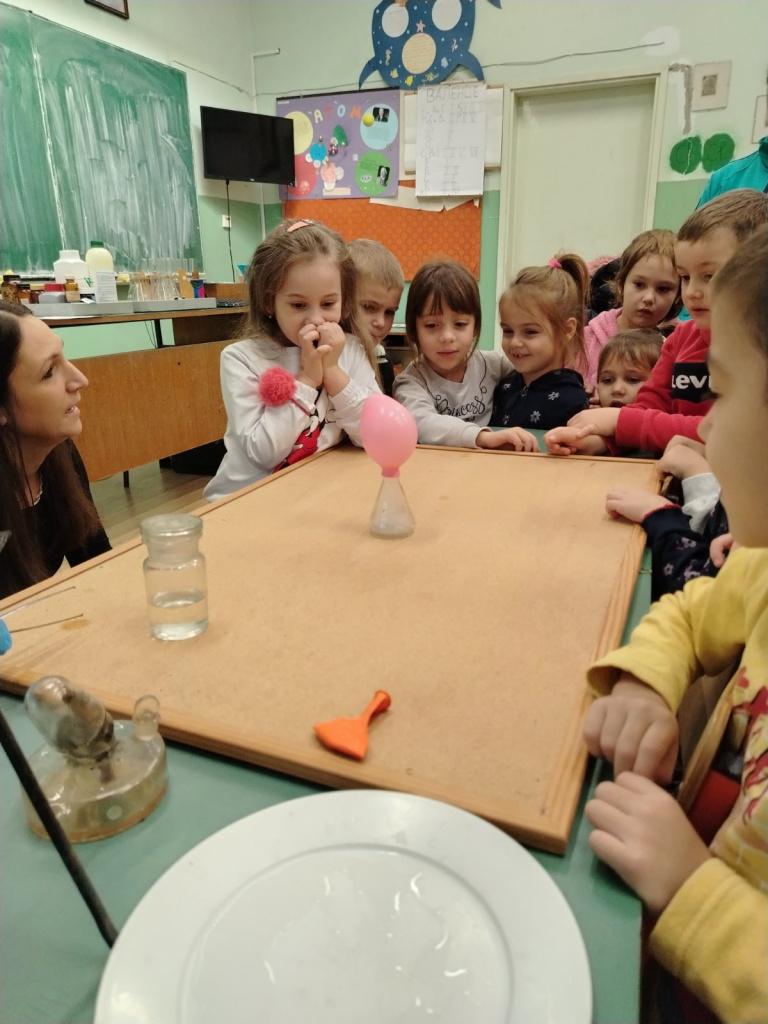 Bili su gosti na času hemije kod nastavnice Milane Tifenbah. Nastavnica hemije Milana je hemijskim ogledima prikazala vodu u sva tri agregatna stanja. Zajedno sa decom izvodili su zanimljive oglede sa vodom. Imali cu za cilj da vide sva tri agregatna stanja vode,kao i značaj vode, čemu nam služi, kakvu korist imamo od nje, a i kako je zagadjujemo i kako možemo to sprečiti. Čas je završen diskusijom o značaju vode za život i o potrebi da je čuvamo i racionalno koristimo. Deca iz vrtića su pokazala veliko interesovanje i aktivno učestvovala u svim aktivnostima. Čas je bio izuzetno uspešan, jer je spojio nauku i kreativnost, uz međugeneracijsku saradnju. Ogledi su bili prilagođeni uzrastu dece, a atmosferu je krasila radost i radoznalost svih prisutnih💧📏⚖️🔬🫧🔎🌡