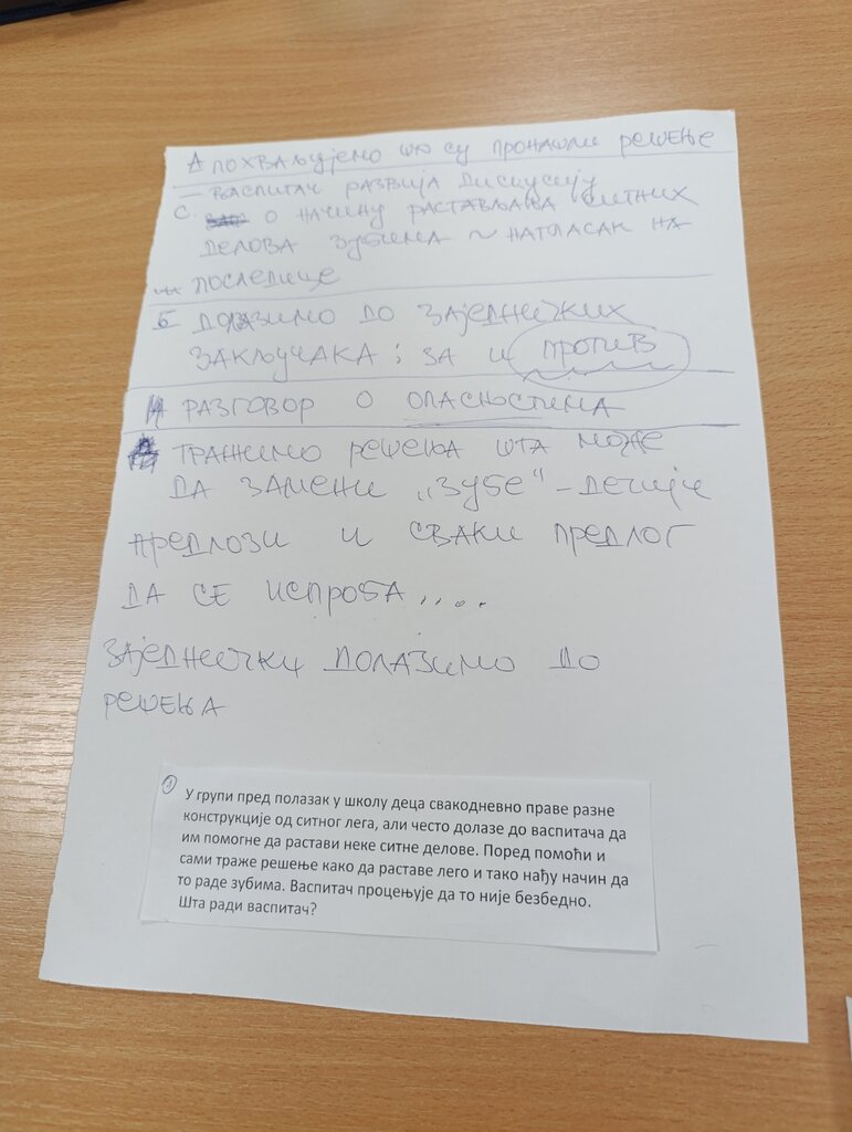 Svoja iskustva u vezi sa temom izložio je tim vaspitača iz PU „Radosno detinjstvo“ Novi Sad, objekat „Kalimero“, koji je kroz primere iz prakse prikazao načine na koje se razvija kultura grupe, gradi saradnički odnos i podržava doslednost u vaspitno-obrazovnim situacijama. PU „Pava Sudarski“ iz Novog Bečeja predstavljali su vaspitači Biljana Gojković, Ivana Kiselički, Anita Roža, Sanja Jovčić i Dijana Brusin. Novobečejski vaspitači posebno su se istakli u rešavanju problem-situacije iz prakse, gde su kroz timski rad predstavili svoje rešenje. Akcenat njihovog pristupa bio je na afirmativnim porukama upućenim deci, podsticanju njihove participacije, uz poštovanje kompetencija, razvojnih karakteristika i bezbednosti dece.